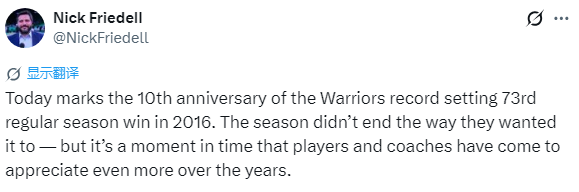 北京时间4月14日,2025-26赛季常规赛已经收官,名记Nick Friedell撰文写道:今天是勇士队常规赛73胜十周年纪念日,这个赛季并没有以他们想要的方式结束,但随着时间的推移,球员和教练们越来越珍惜这一时刻。